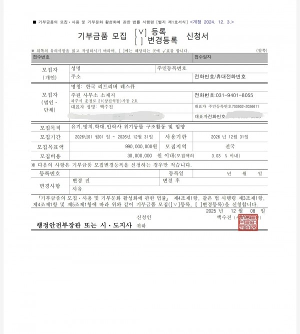 기부금품 모집 등록 완료 하였음을 아래와 같이 공지 합니다.