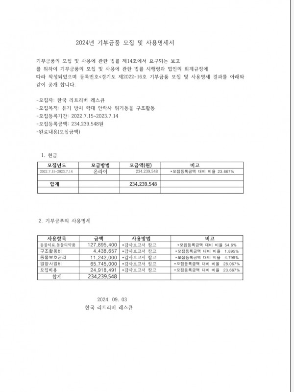 따라 작성되었으며 등록번호<경기도 제2022-16호 기부금품 모집 및 사용명세 결과를 아래와 같이 공개 합니다.
